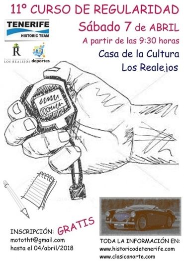 La fecha de celebración será el próximo sábado 7 de abril en la Casa de la Cultura de Los Realejos. Este curso forma parte de las actividades relacionadas con la Clásica Norte y el Histórico de Tenerife y al igual que en anteriores ocasiones tendrá carácter gratuito. Constará de parte teórica y práctica, debiendo los interesados inscribirse a través del correo mototht@gmail.com. El THT quiere agradecer a la Concejalía de Deportes del Ayuntamiento de Los Realejos las facilidades dadas para la realización de este curso.