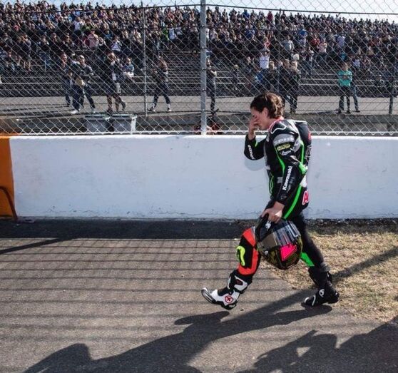 Ana Carrasco llegó emocionada a la zona de boxes tras hacer historia al ser la primera mujer que gana un título mundial de motociclismo compitiendo contra hombres. Fotos: Redes Sociales Kawasaki España