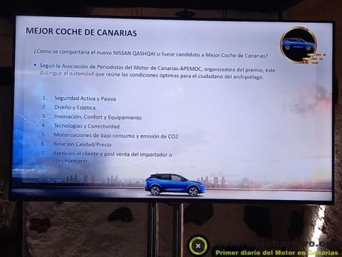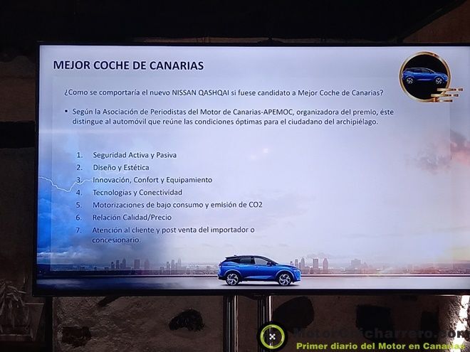 Asimismo y dada la importancia de este lanzamiento y presentación, de un modelo, el Nissan Qashqai que creo un segmento, C-SUV y revoluciono el mercado europeo, español y canario, Nissan Iberia, a través de Francesc Corberó, director de Comunicación de Nissan Iberia, ha decidido durante la presentación del modelo ante los medios de comunicación canarios “presentar el Nuevo Nissan Qashqai como candidato al certamen Mejor Coche de Canarias. Estamos seguro que este icónico modelo en su tercera generación va a ser un fuerte contendiente a este prestigioso premio, organizado por la Asociación de Periodistas del Motor de Canarias – APEMOC”.