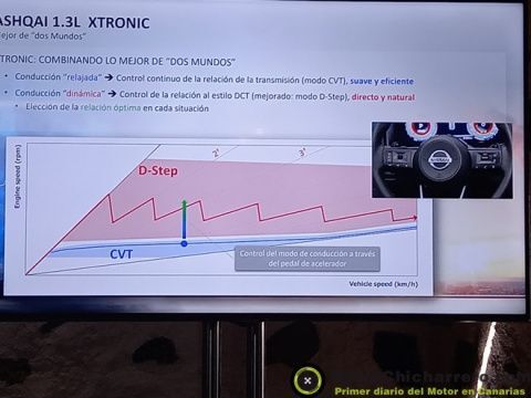 La nueva caja de cambios automática Xtronic está diseñada para ofrecer lo mejor de ambos mundos en la conducción diaria. En ciudad, con aperturas parciales del acelerador, la aceleración es fluida, mientras que el régimen del motor se mantiene constante. Cuando se requiere una aceleración inmediata, la caja de cambios encuentra instantáneamente la relación óptima y reacciona de forma escalonada, aportando una sensación de mayor conexión. En cualquier caso, si el conductor prefiere utilizar el cambio en modo manual, siempre tendrá a su alcance las levas del cambio que han sido convenientemente ubicadas detrás del aro del volante para un manejo cómodo y seguro.